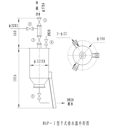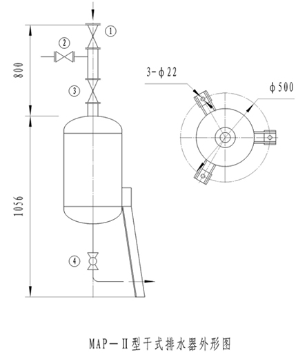 4.當(dāng)檢修或吹掃時,關(guān)閉閥①或在閥后堵盲板,從閥②接蒸汽或氮?dú)獯党?br /> 5.排水器按管法蘭為JB81-94,PN1.6DN50。