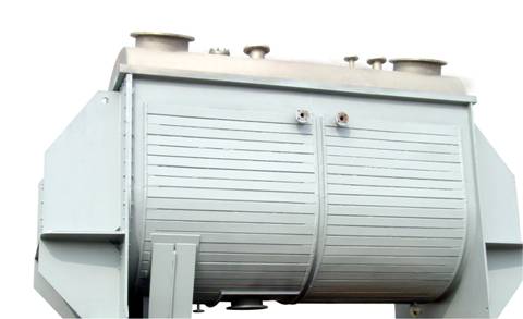 HTM型螺條式混合機(jī)結(jié)構(gòu)如圖所示,它有傳動(dòng)部件、筒體、筒蓋、特殊布置的螺條主軸、出料閥等組成。