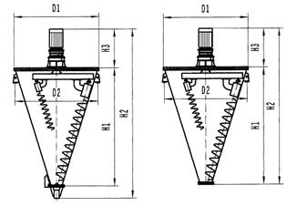 2、該機適用于固(粉)~固(粉)(粉體粒度20—400目/英寸)混合及固(粉)~液(含液量<15%)的混合。特殊的錐體帶夾套裝置,可對物料進行加熱、干燥、冷卻。